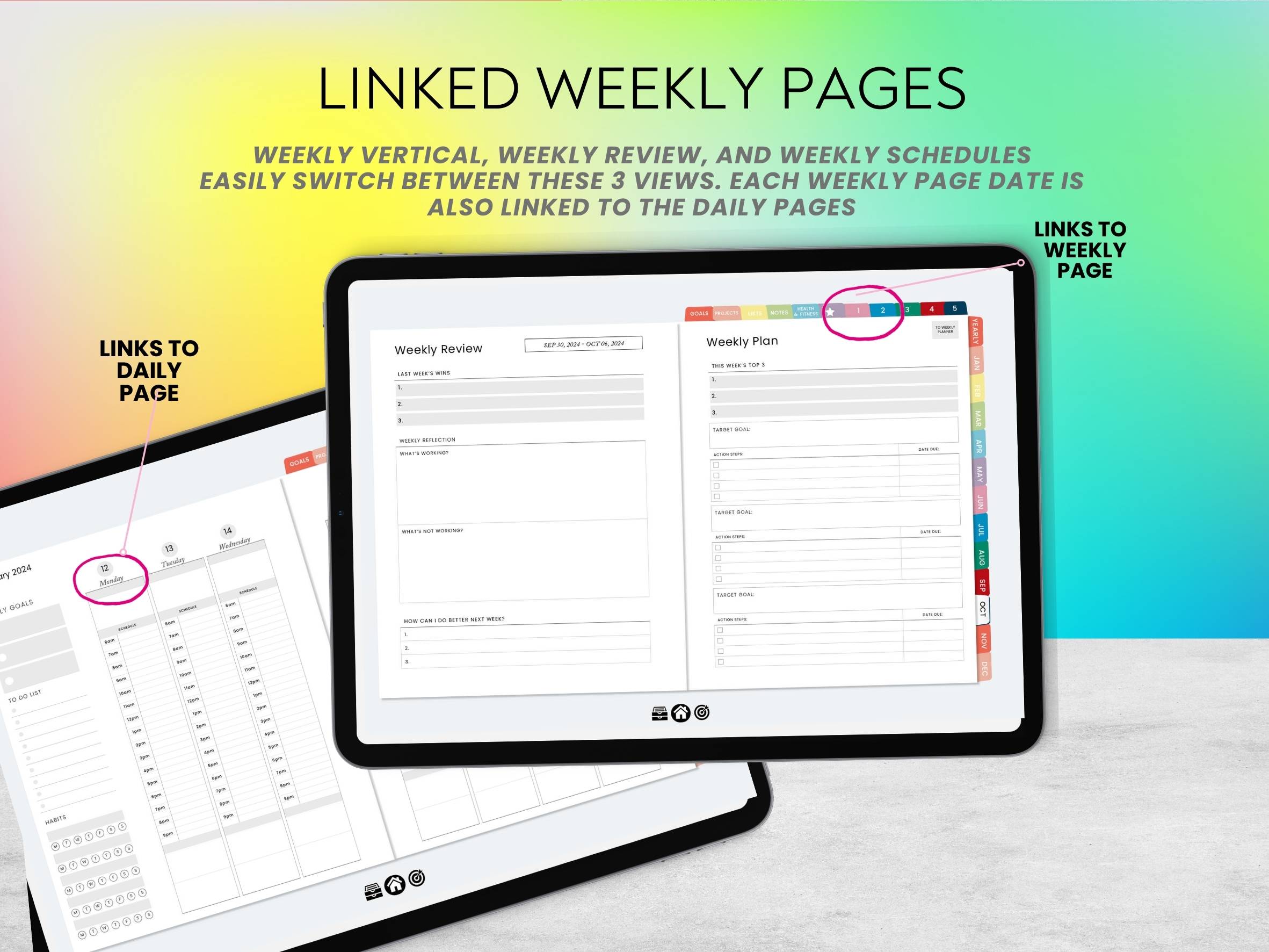 You can go from each weekly layout with a click of a button. They are all interlinked. Go from review to weekly plan to weekly schedule and back again. Or go to the daily page and go back to that corresponding week instantly! You can also go back to the menu of your section with the "back to" button.