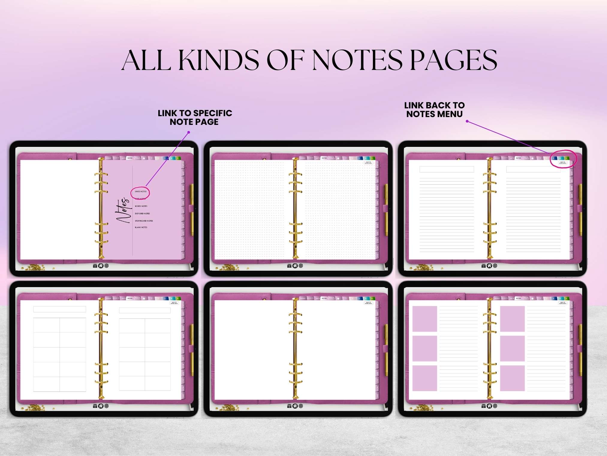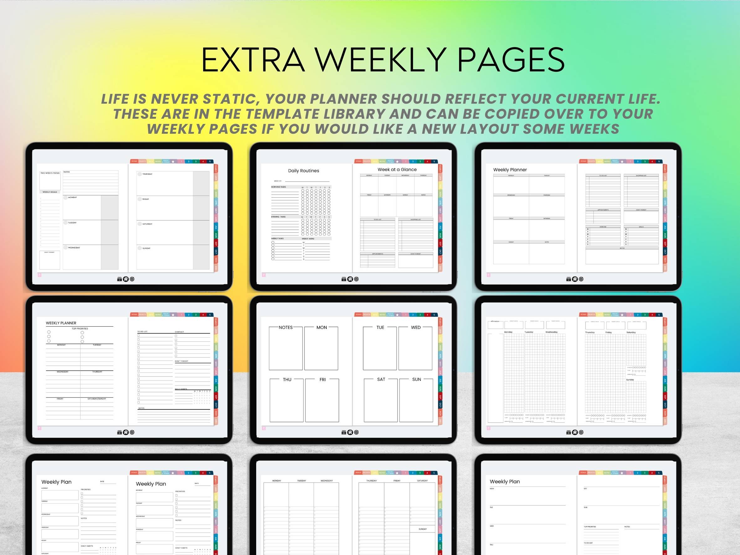 No need to purchase any other "add-ons". This planner includes a template library full of pages for businesses, finances, household, general planning pages (tons of layouts to choose from), health and fitness, habit tracking, personal, blog/youtube, student/teacher
